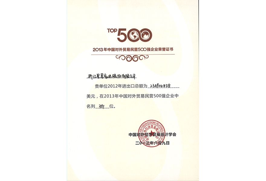 2013年中國(guó)對(duì)外貿(mào)易民營(yíng)500強(qiáng)企業(yè)榮譽(yù)證書(shū)
