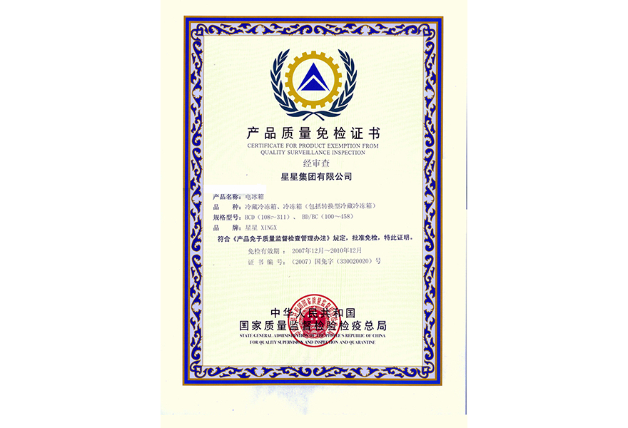 2007年12月產(chǎn)品質(zhì)量免檢證書(shū)